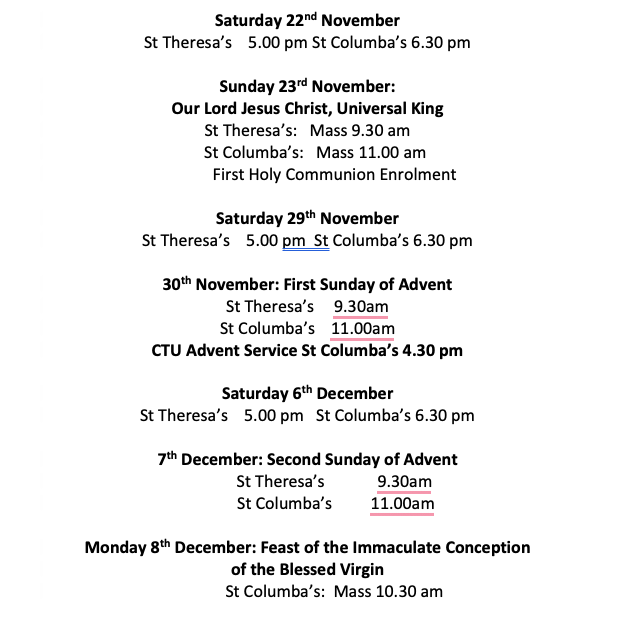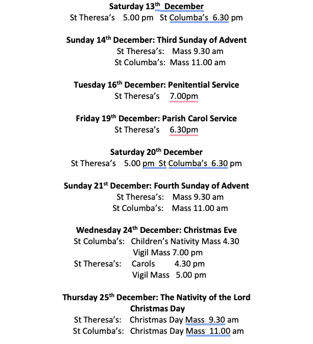Mass times for Christmas at St Columba’s and St Theresa’s